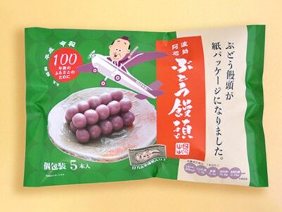 今日は「徳島県美馬市の老舗和菓子店が作る銘菓!100年以上愛されている『ぶどう饅頭』の魅力とは?」というトピックスでお届けしました。柔道剣道の「武道」と果物の「葡萄」のような見た目。両方にかかっていたのですね。108年前にこのユーモア!当時の人は驚いたでしょう。それが今や親子三代で味わえる徳島の銘菓に!葡萄/武道だからまんじゅうの世界の「黒帯」ですね
