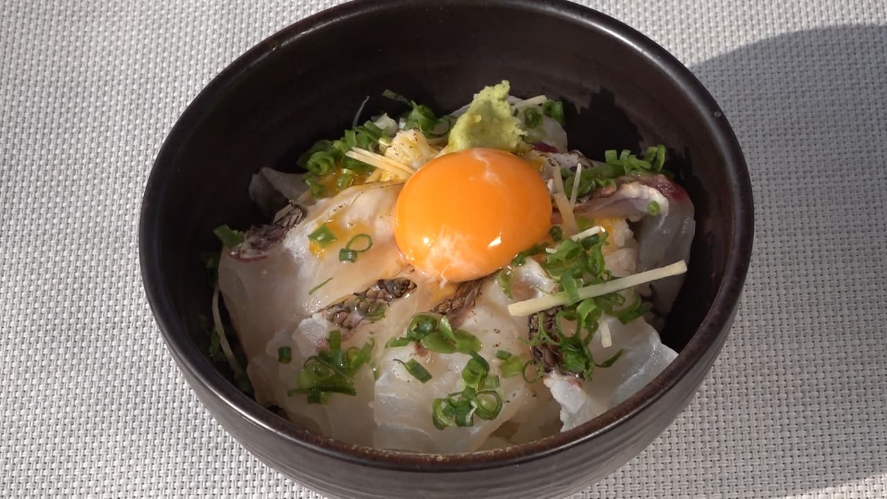 皮が付いたままの身を湯引きして切り分けた身をどんぶりに乗せてバーナーで皮目をあぶり、ネギや卵黄をご飯の上に乗せて完成!