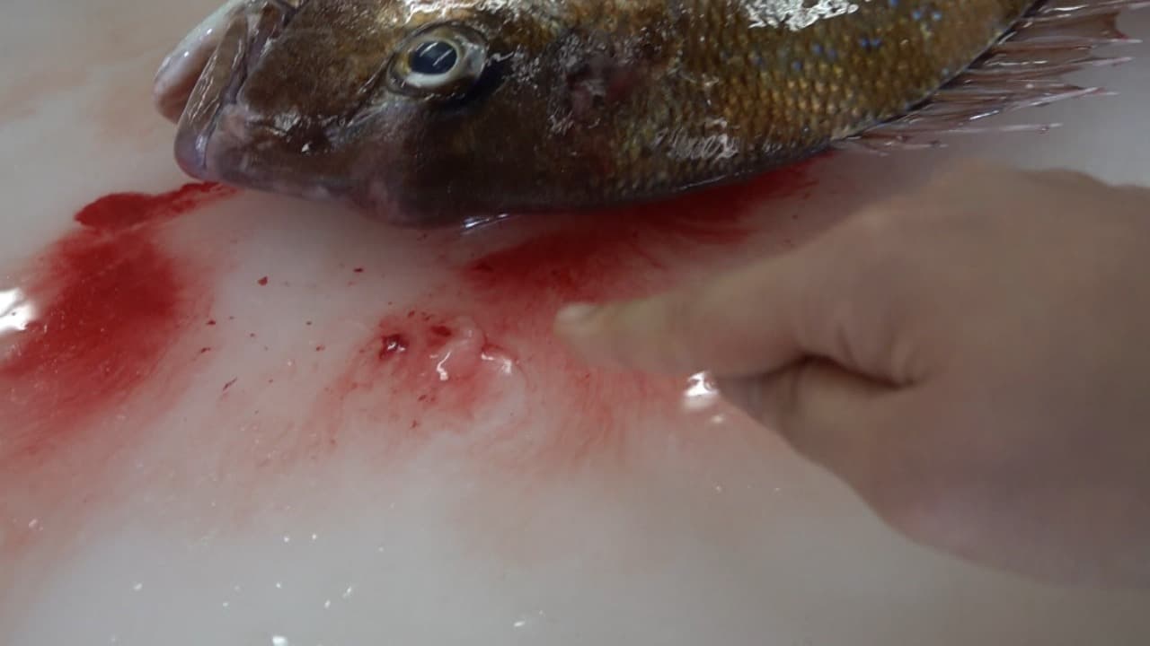 こめかみに穴をあけてタイをしめた後、尾びれの付け根に切れ込みを入れて背骨に沿って高圧で水を入れると・・・白っぽい神経が!