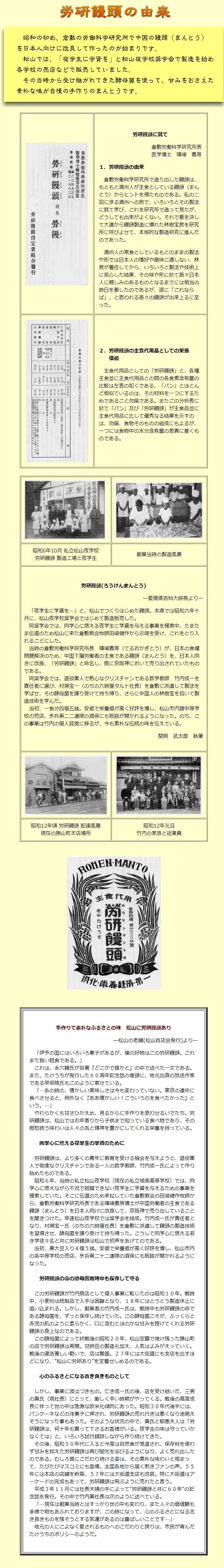 松山での販売開始は1931(昭和6)年。不況で苦労している夜学生に学資を供給することを目指して、当時、松山夜学校で数学教師を務めていた竹内成一氏が責任者となって校舎の一角に工場を作り、「労研饅頭」の製造販売を始めた。1937(昭和12年)には個人事業として受け継ぎ、「たけうちの労研饅頭」として長く地元で親しまれている。