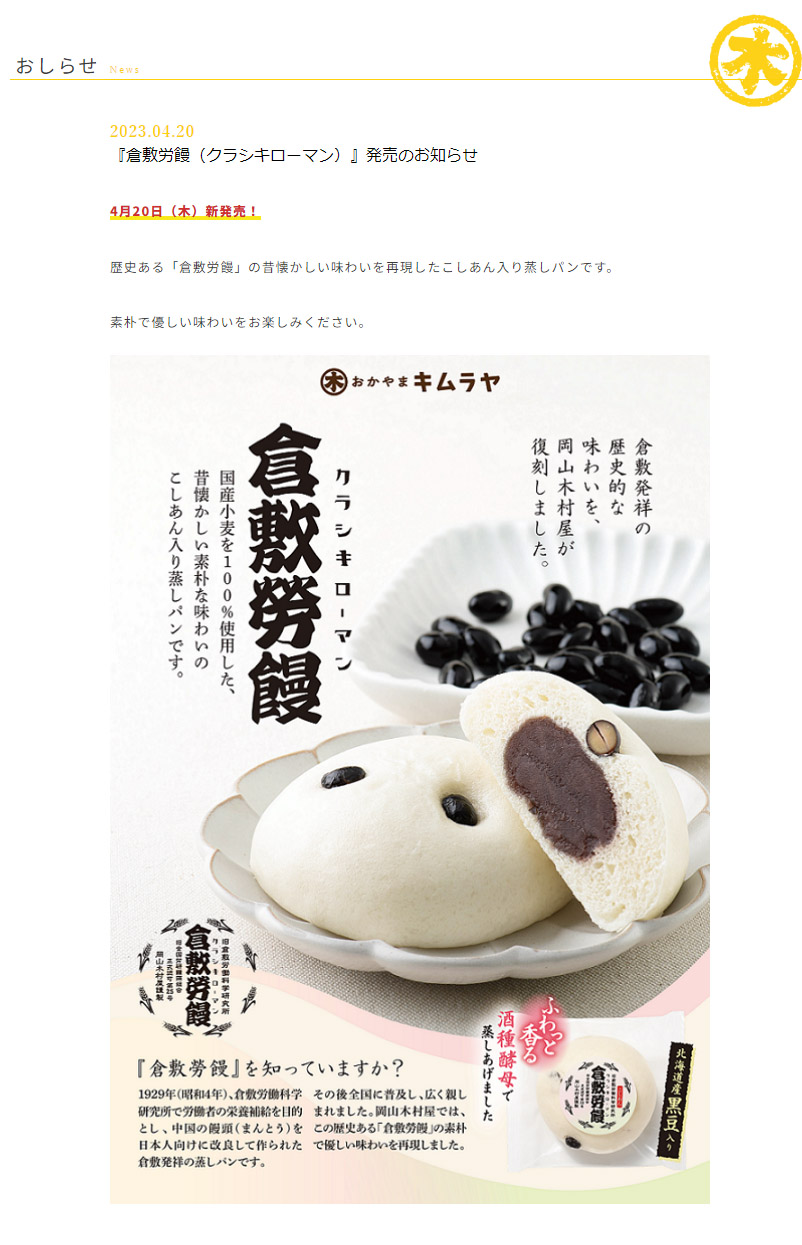 1936(昭和11)年には全国37カ所で販売されていた「労研饅頭」だが、「たけうち」と共に最後の2軒として残っていた「丹生製パン」(岡山県備前市)が2020年4月に惜しまれつつ閉店。現在は同店が戦前から続く独自の酵母菌と共に「労研饅頭」の味を伝える全国唯一の店となっている。商品開発にあたっては、のちに「六時屋タルト」の社長となる村瀬宝一さんが倉敷に赴いて製法を学んだほか、中国山東省の出身で料理人の林樹宝さんが来日し、製造技術を指導したという。